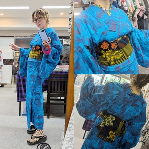 藤木屋スタッフデー フリルカットソーにペンダントをして、アンティーク着物に紐付き角帯を締めた。足元はロージャボの足袋に角草履。メンズの単の黒羽織を羽織った。