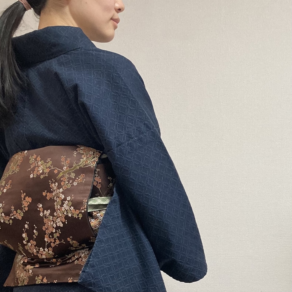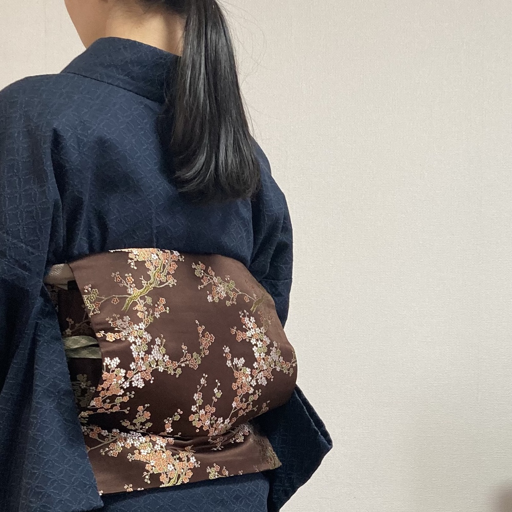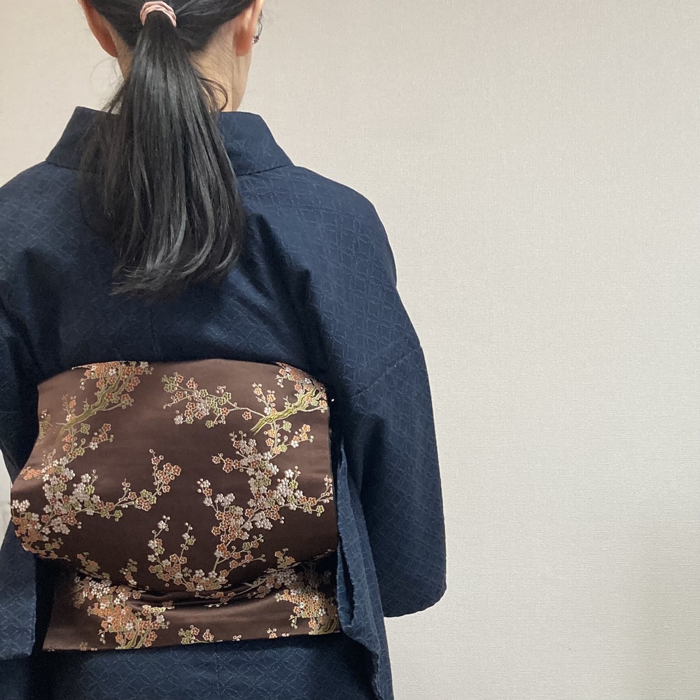 小花柄の茶色い名古屋帯