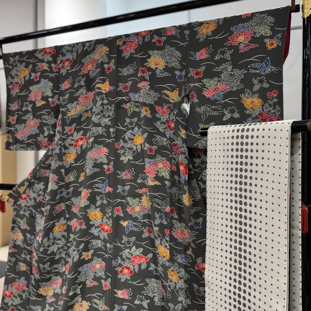 今年もきものサローネ2025でお着物のレンタルが可能です。 一般予約開始に先駆けてレンタル商品をご紹介! 栗山吉三郎の和染紅型が映える、上質な絹地に繊細で華やかな柄を染めた高級小紋着物です。 B-4レンタル着物逸品 身丈170cm/裄67cm 高島織物袋帯