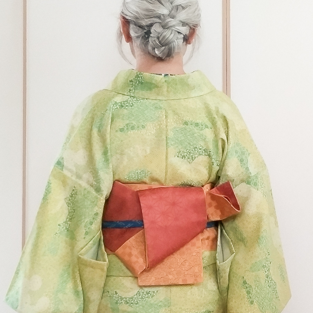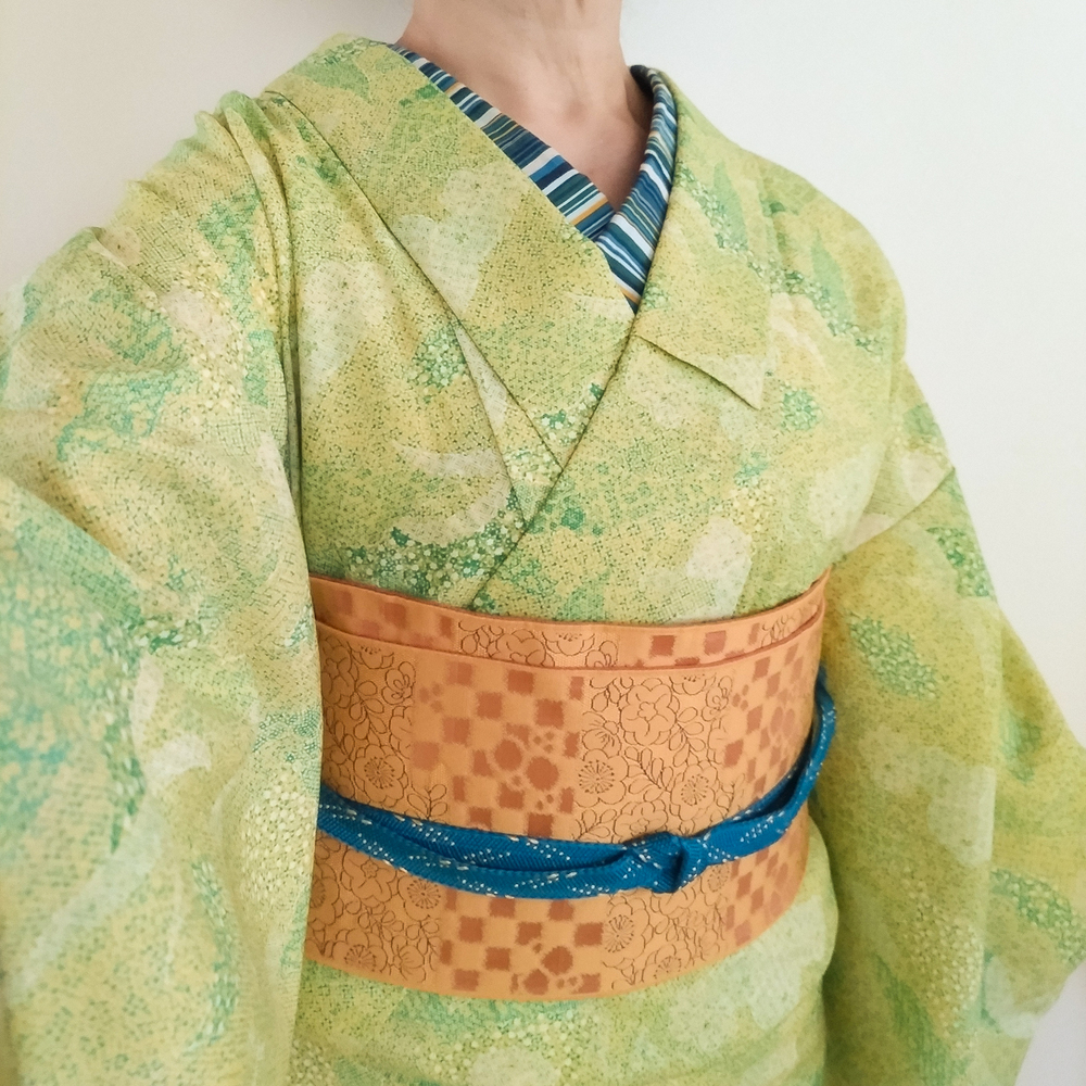 暑くも寒くもなく少しヒンヤリな感じでちょうどいい感じ。顔色がよく見える黄緑のウール着物に青を効かせてそれなりにシャキッとさせたつもり。