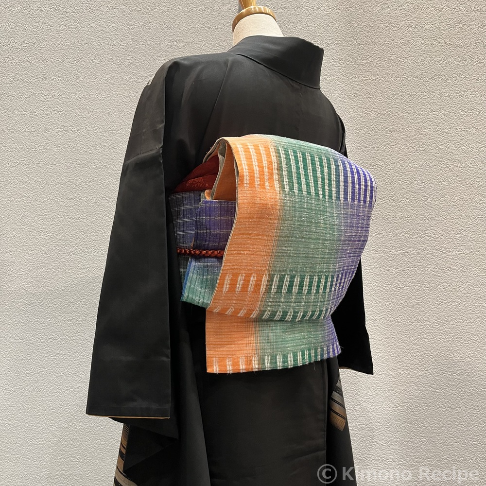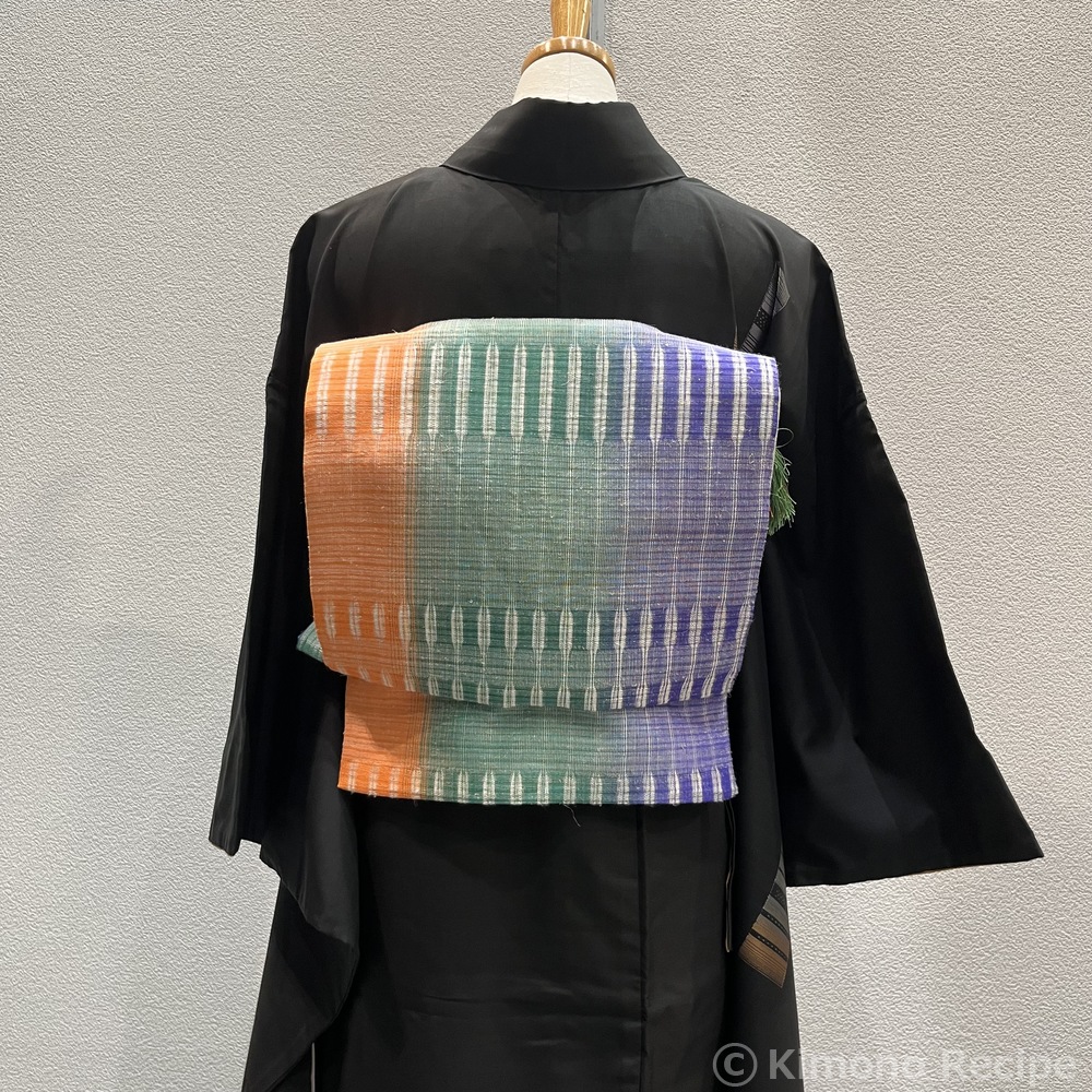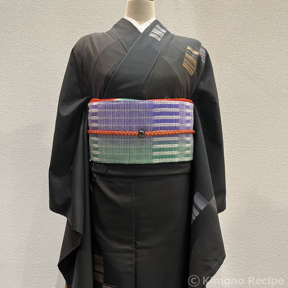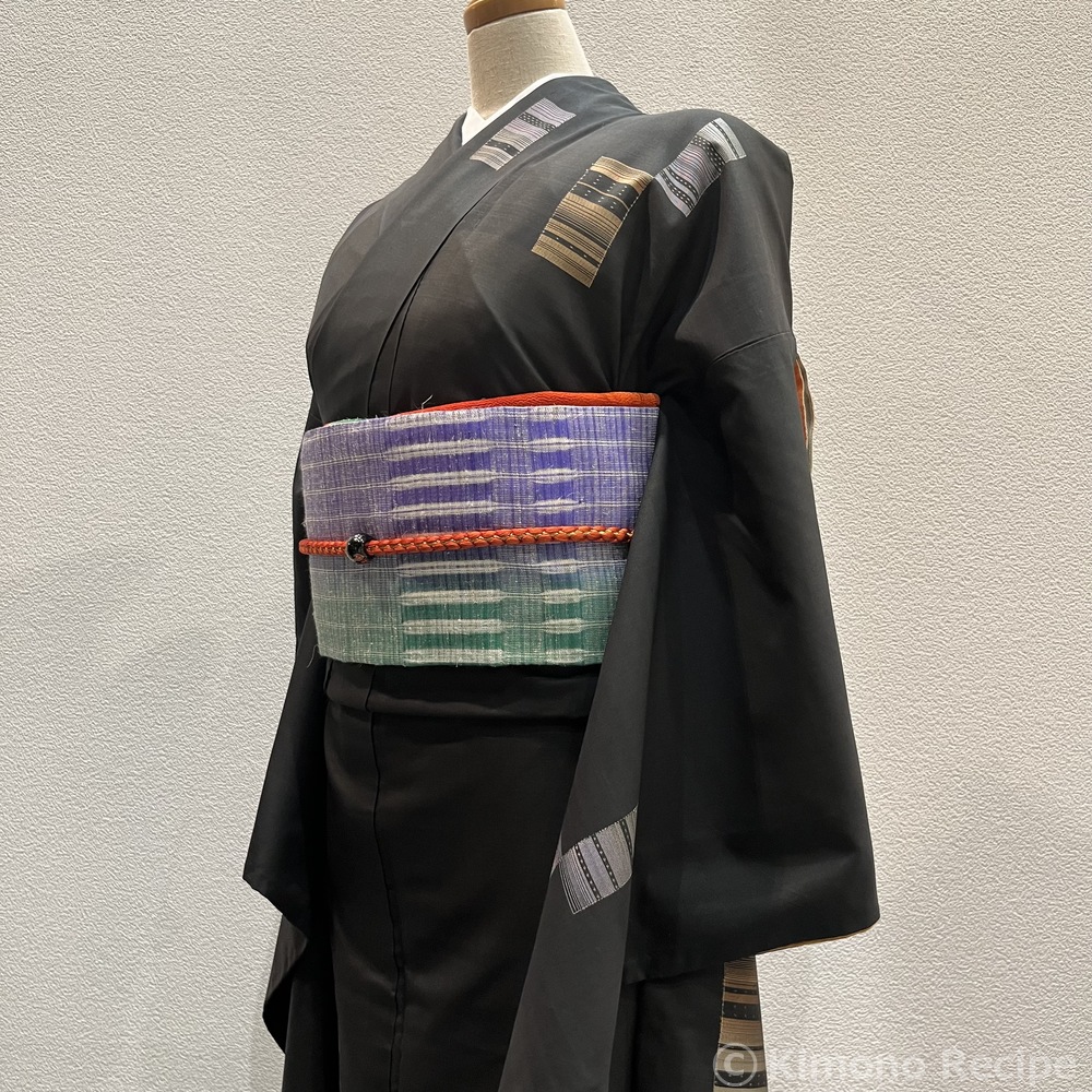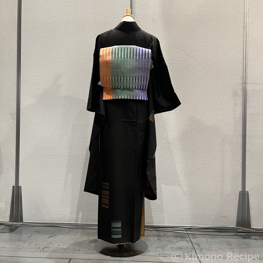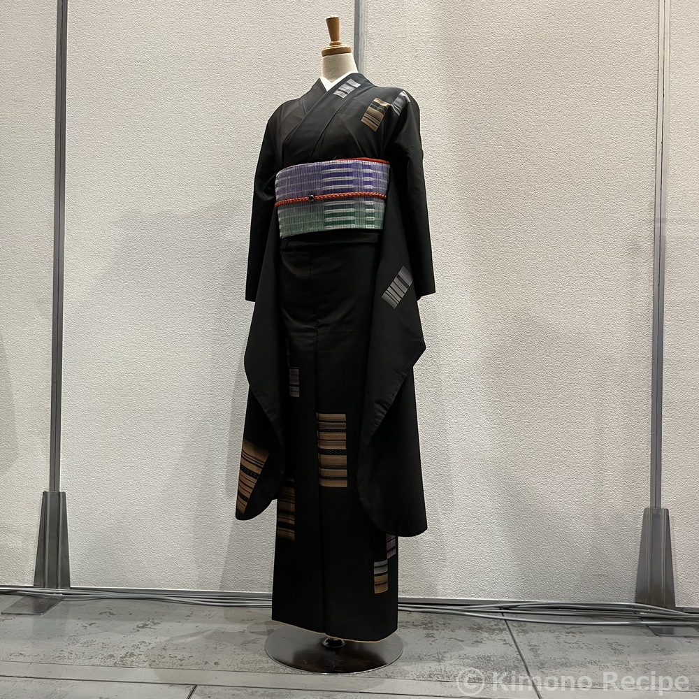 出展者:みなみ紬 泥染の黒に芭蕉布の帯を合わせました。 振袖 980,000円 帯 380,000円 (税別) 着付師:大久保 美生(美容師TUKURIBA)