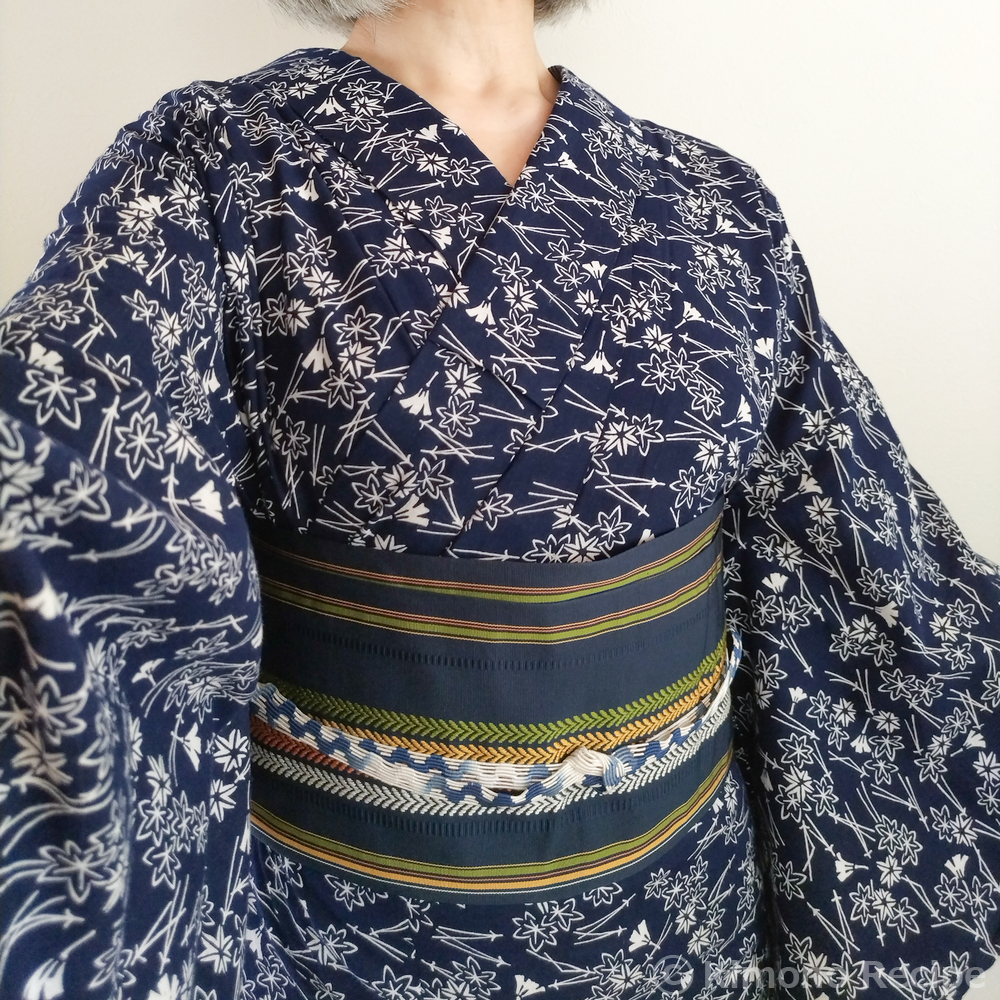 予想最高気温25℃、霧は晴れたけど風も弱めでなんだか蒸す感じ。 なんとなく目についた吹き寄せ柄の浴衣を着ました。赤系の帯の気分でもなくて紺にしたらかなり落ち着いた感じに。 身丈的には腰紐低めでおはしょりが出る筈ですが身丈と身幅のバランスが私の体型に合わないらしくて着辛いので対丈で着ました。 それ程厚くないタイプの綿コーマなのでまぁまぁ涼しいです。