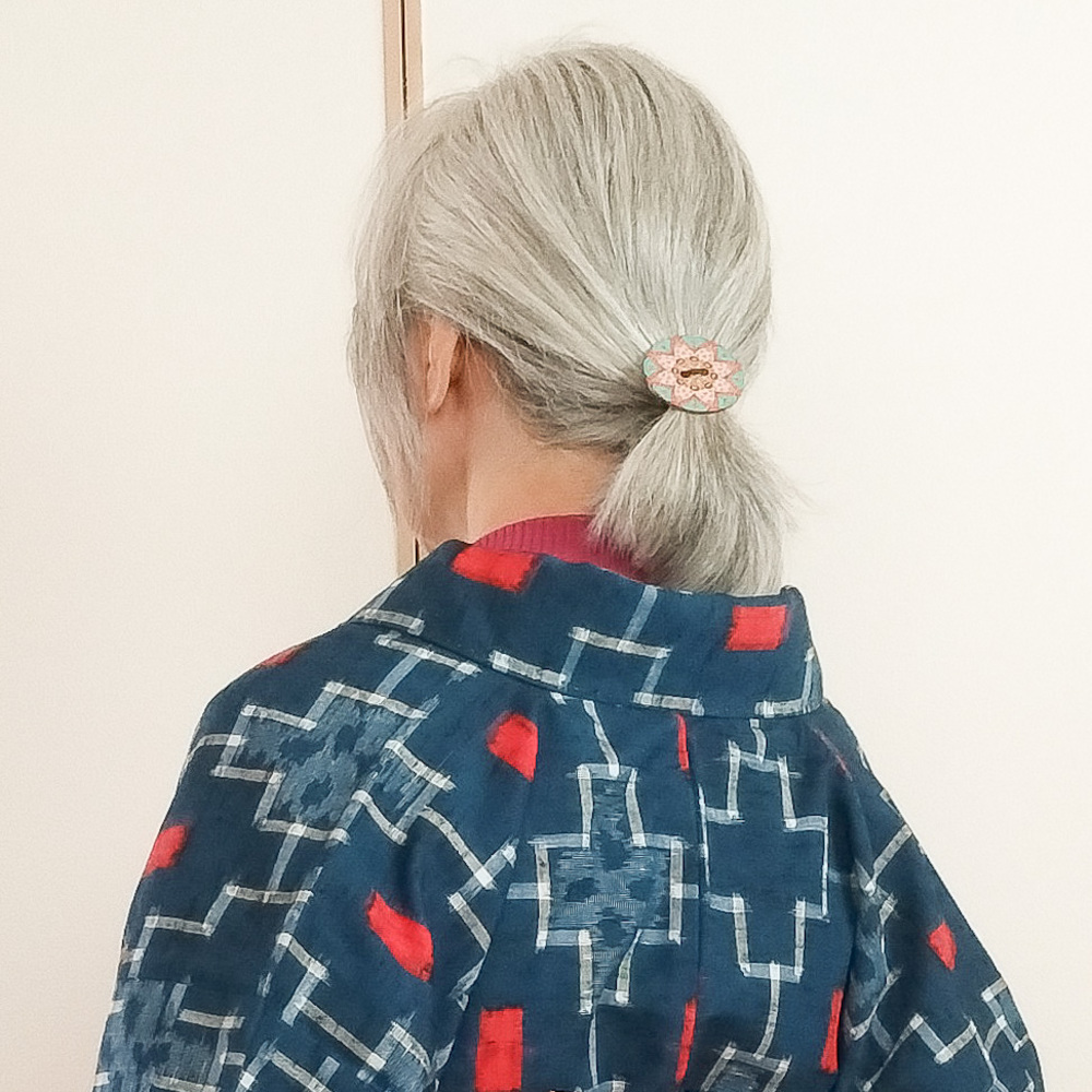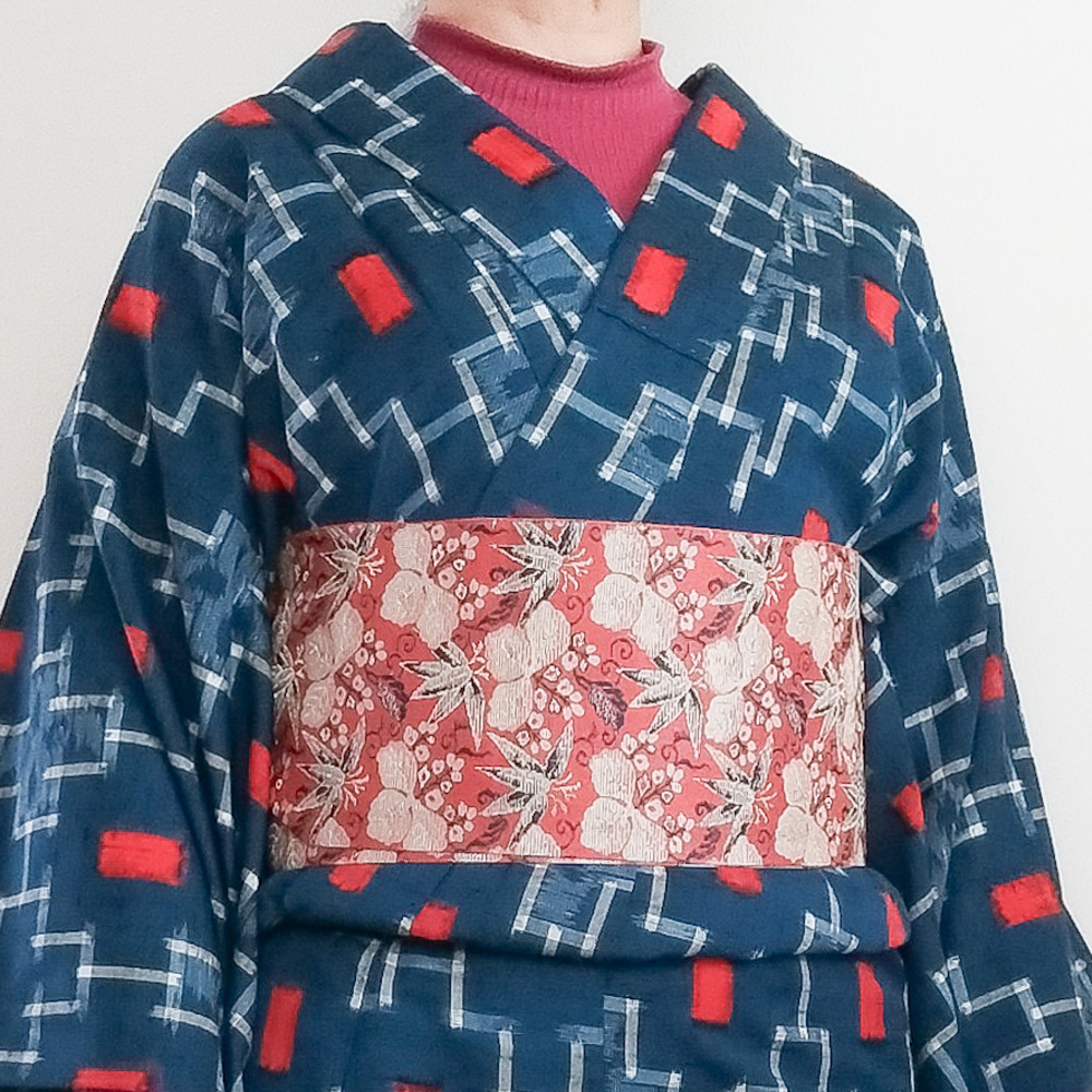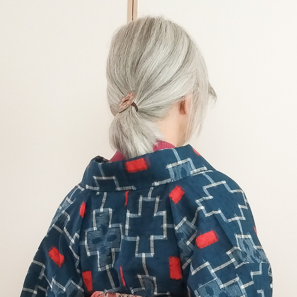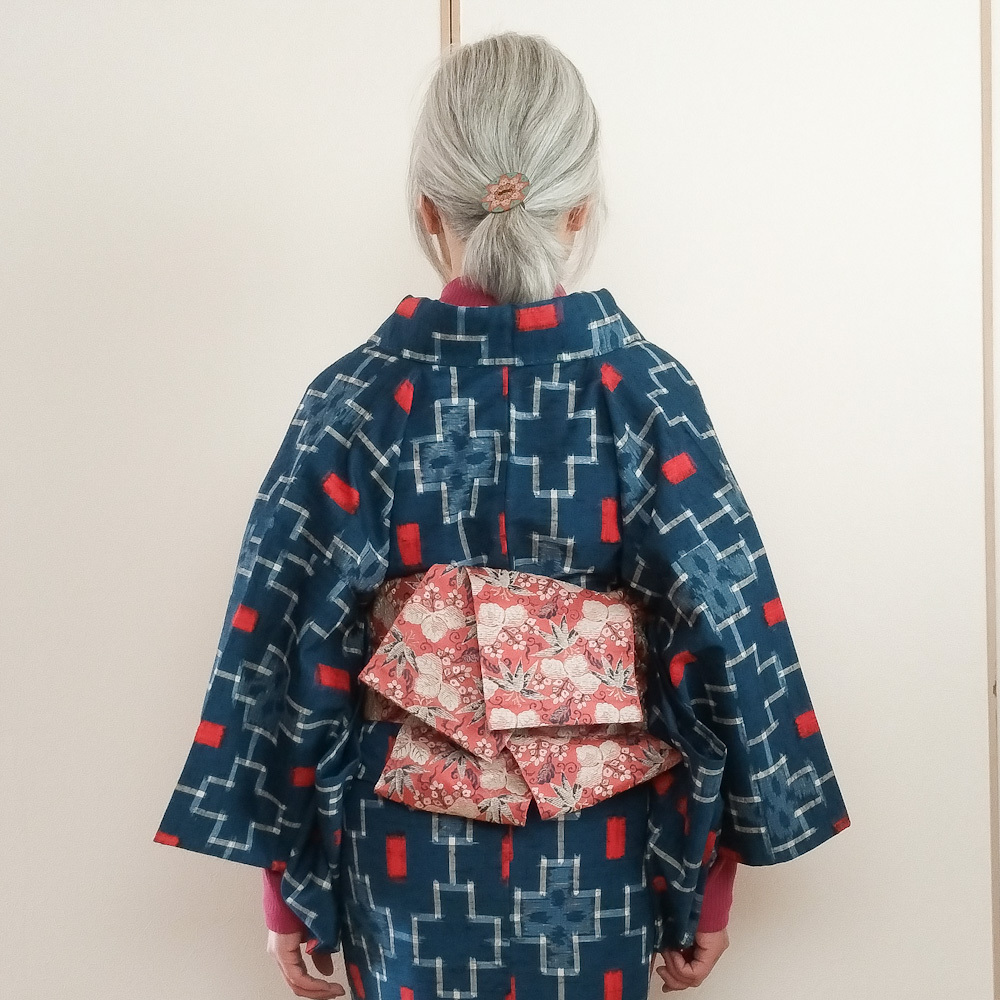 昨日は脱タートルとか言っていたけど最高気温は10℃に届かず、今日も陽射しがないので地味に寒くてハイネックをイン。 半幅は駒下駄結びの垂れと手をクロスさせて上下に出し、上を折り返すアレンジ。 髪は飾りボタンで作ったヘアゴムでひとつ結び。結び目近くを少しほぐしました。