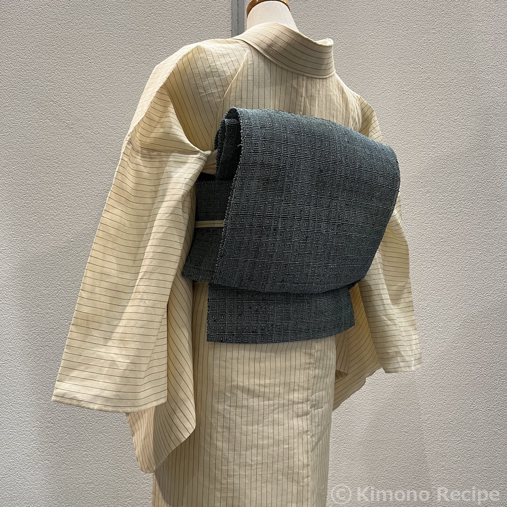 合わせた雷文様の帯は、手績みの糸だけが持つ張りと素材の力にあふれた通好みの一本。