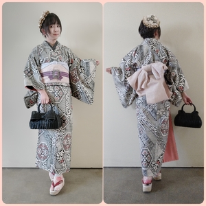 袷_アンティーク_桃色に大輪の花_二尺袖