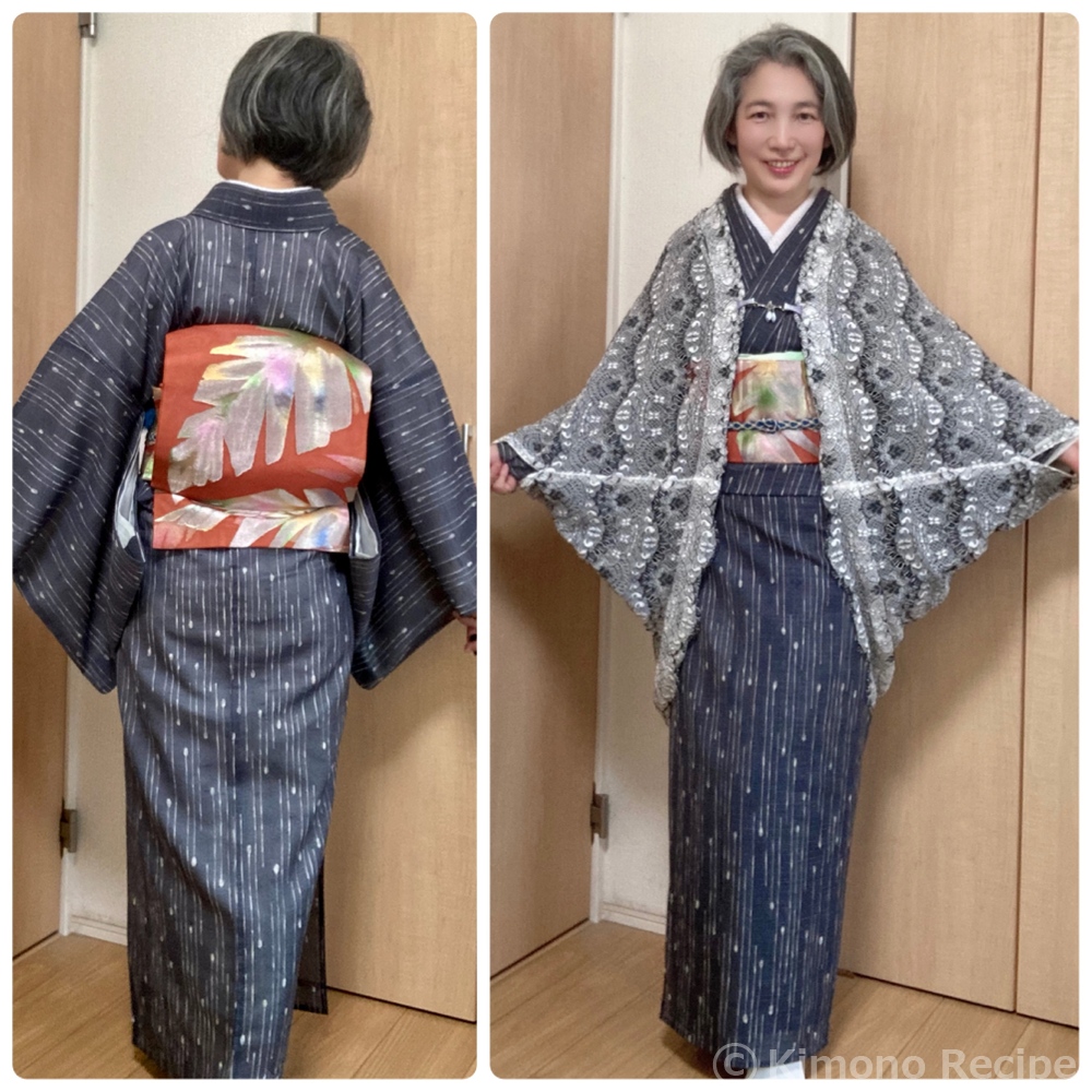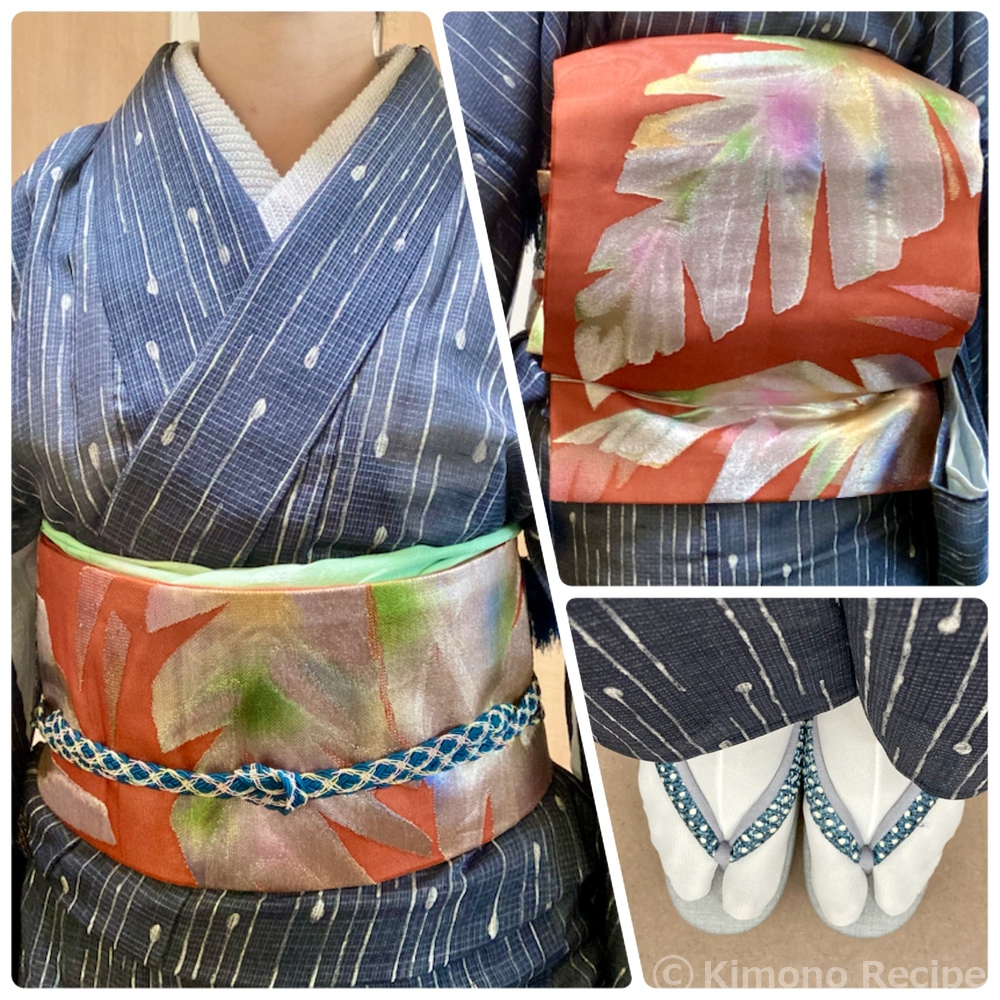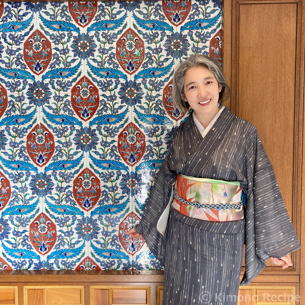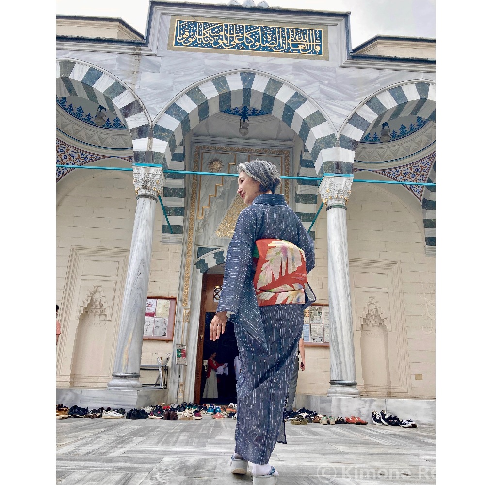 東京ジャーミイを見学してきました。東京の中のトルコ🇹🇷 なかなか馴染みのないイスラム文化を垣間見ることができて興味深かったです。 梅雨の中休みで真夏日だったので、変わり雫柄の紗紬に、派手な葉っぱ柄の紗の帯を初着用して地味にならないように。 これに夏用の青い帯締をおろし、薄緑の帯揚と合わせて。 足元は、帯締に似た鼻緒の薄灰色のカレンブロッソ。 礼拝堂の中で女性はスカーフ必須なので、スカーフを兼ねてレースの白黒モモンガコートを。