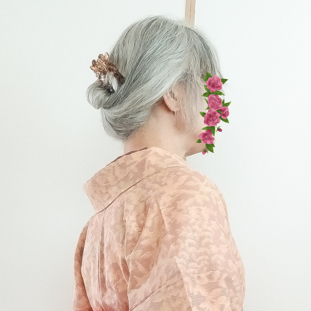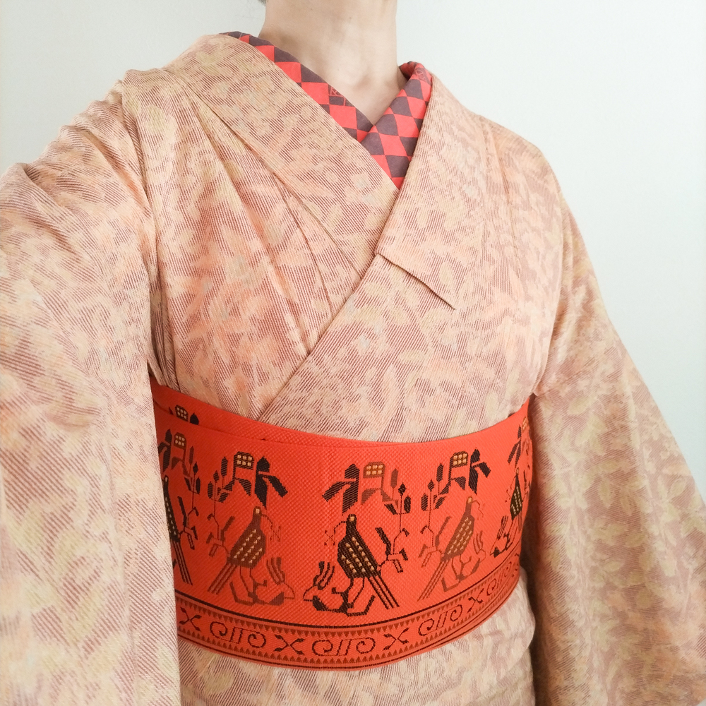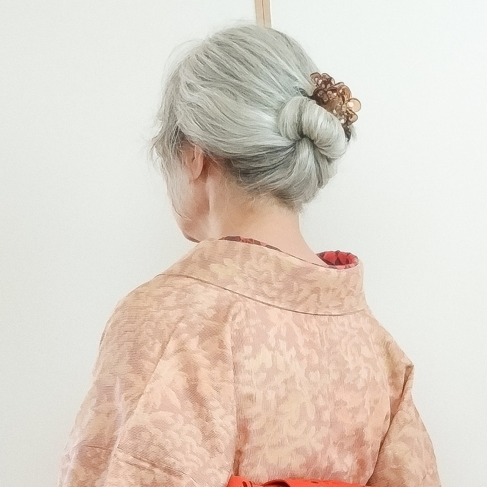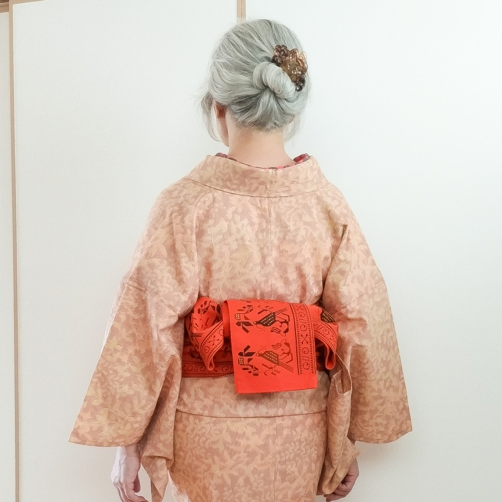 昨日のウール着物のコーデ違い。後ろの袖付寸法が気になって確認したら以前間違えて直していたらしく、正しい寸法にしてから着用。 半幅は可愛い鳥を目立たせたくて帯締め無しでOKな文庫のアレンジに。髪はワックスを付けてから捻じってお団子にした毛先をクリップで固定。パッと見は簪に見えなくもない…? 後ろ袖付を直したので多少後ろ袖の攣れ皺はマシになったかも。