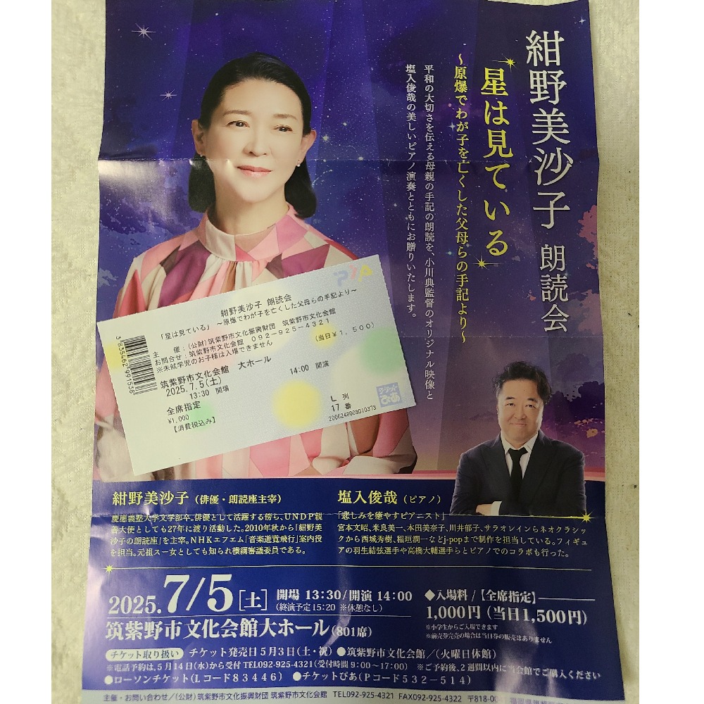 筑紫野市にて紺野美沙子さんが朗読劇を公演。朗読劇とピアノと映像の演出が素晴らしかった。プロは良い!!