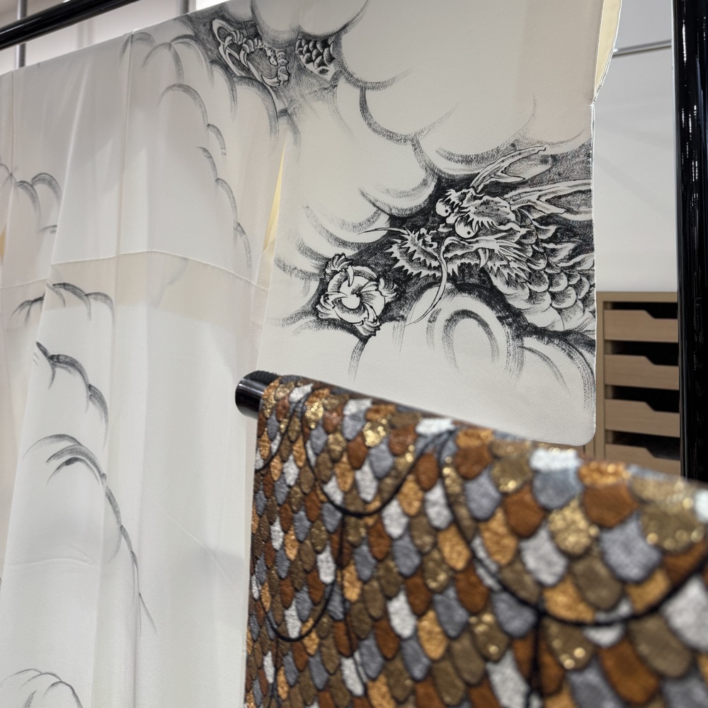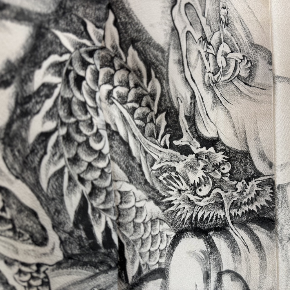 今年もきものサローネ2025でお着物のレンタルが可能です。 一般予約開始に先駆けてレンタル商品をご紹介! インパクトのある墨絵の龍の訪問着に龍の鱗をイメージした帯を合わせコーディネートです。帯は誉田屋源兵衛は、285年の歴史を持つ京都の老舗帯メーカーで、最高品質の素材と独自の美学で唯一無二の帯を生み出す工芸ブランド 誉田屋源兵衛のお品です。 B-1レンタル着物逸品 身丈165cm/裄67cm 誉田屋源兵衛袋帯