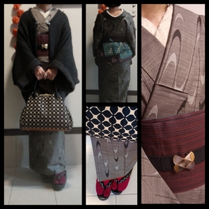 アンティーク 矢羽根 和洋折衷 半幅帯 柄足袋 角草履 カレンブロッソ 回さない結ばない帯結び MIKISAKURA がま口バッグ