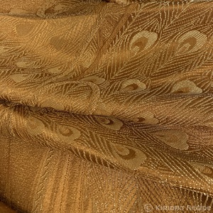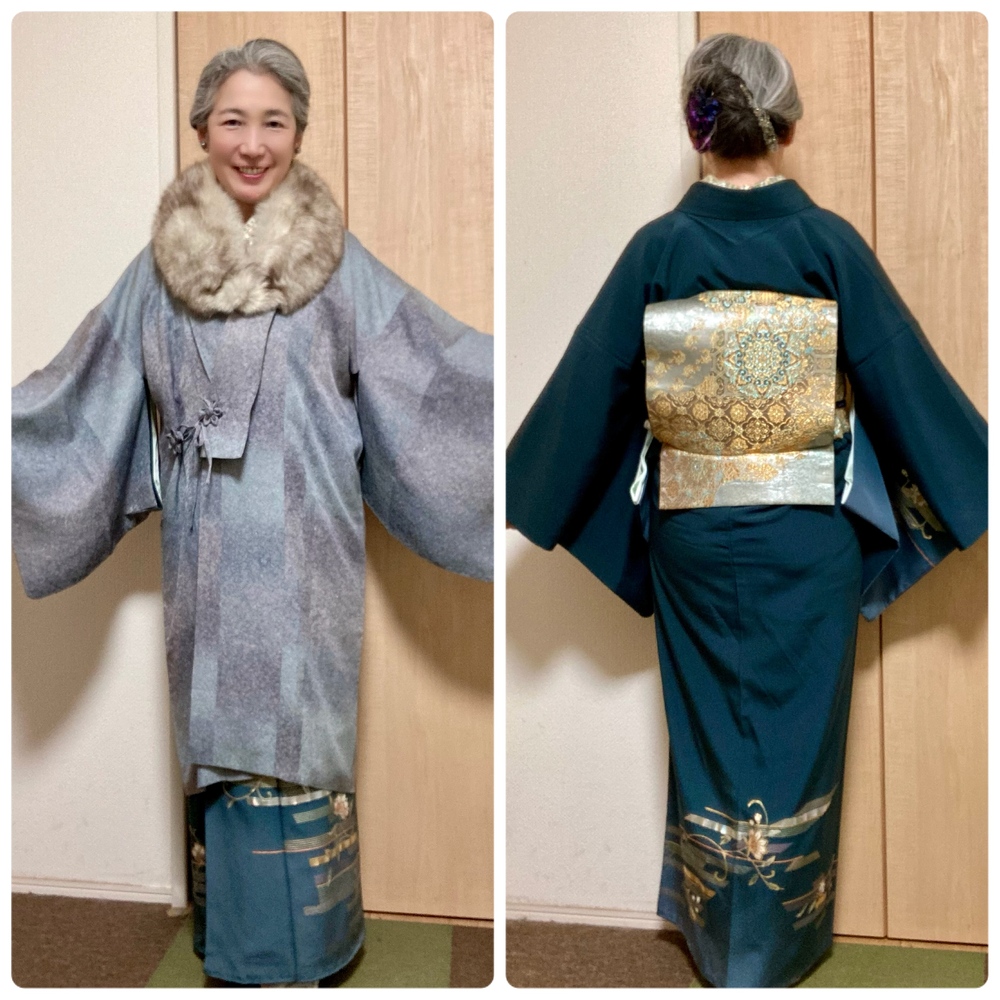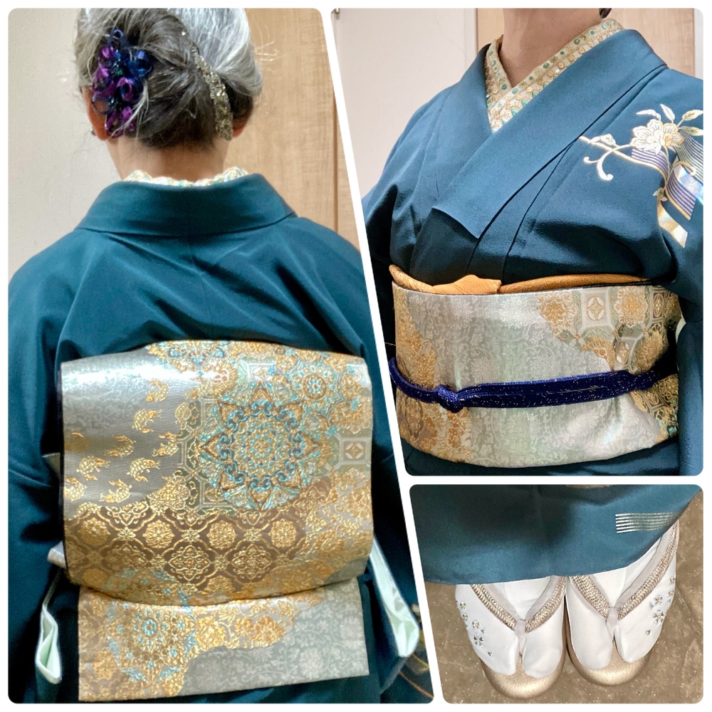 同窓会へ。一流ホテルの宴会場での開催ということで、華やかなフォーマルコーデにしたけど、ちょっと派手すぎた…。 和田光正の鉄色の金彩訪問着に、金緑色の裂取華紋のフォーマル袋帯を初着用。 金茶の孔雀帯揚も初。 半襟の金緑スパンコールインド刺繍リボンが目立った