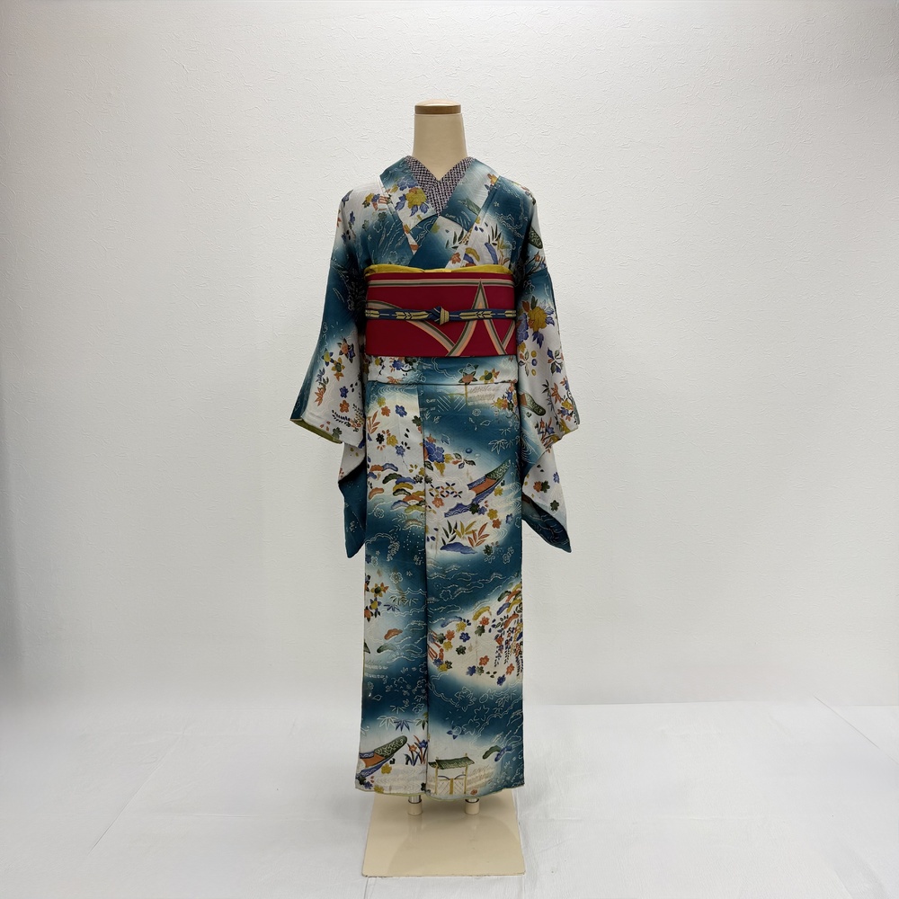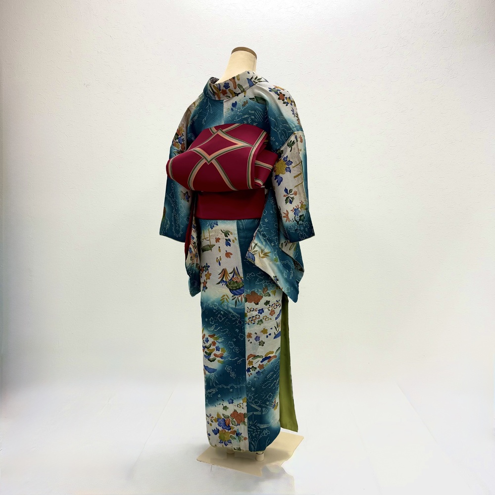 こちらのアンティーク着物は現代の標準寸法とは異なり、体型によってはすべてのサイズがぴったり合わない場合がございます。着付けの際に工夫を凝らし、美しくお召しいただけるよう調整いたしますが、あらかじめアンティークならではの特徴としてご理解いただけますと幸いです。丈が短い場合もございますのでご自身でブーツや、足元が見えても素敵な工夫をしていただけるとより良いかと思います。