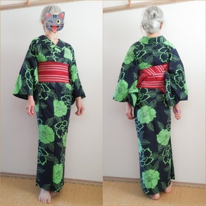 牡丹のプレタ浴衣に献上柄の抹茶半幅で侍結び