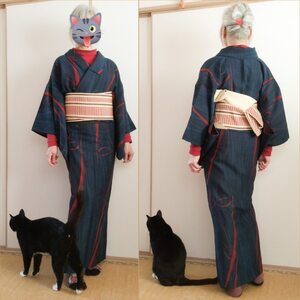 濃紺のウール着物に自作の襦袢風カットソーイン